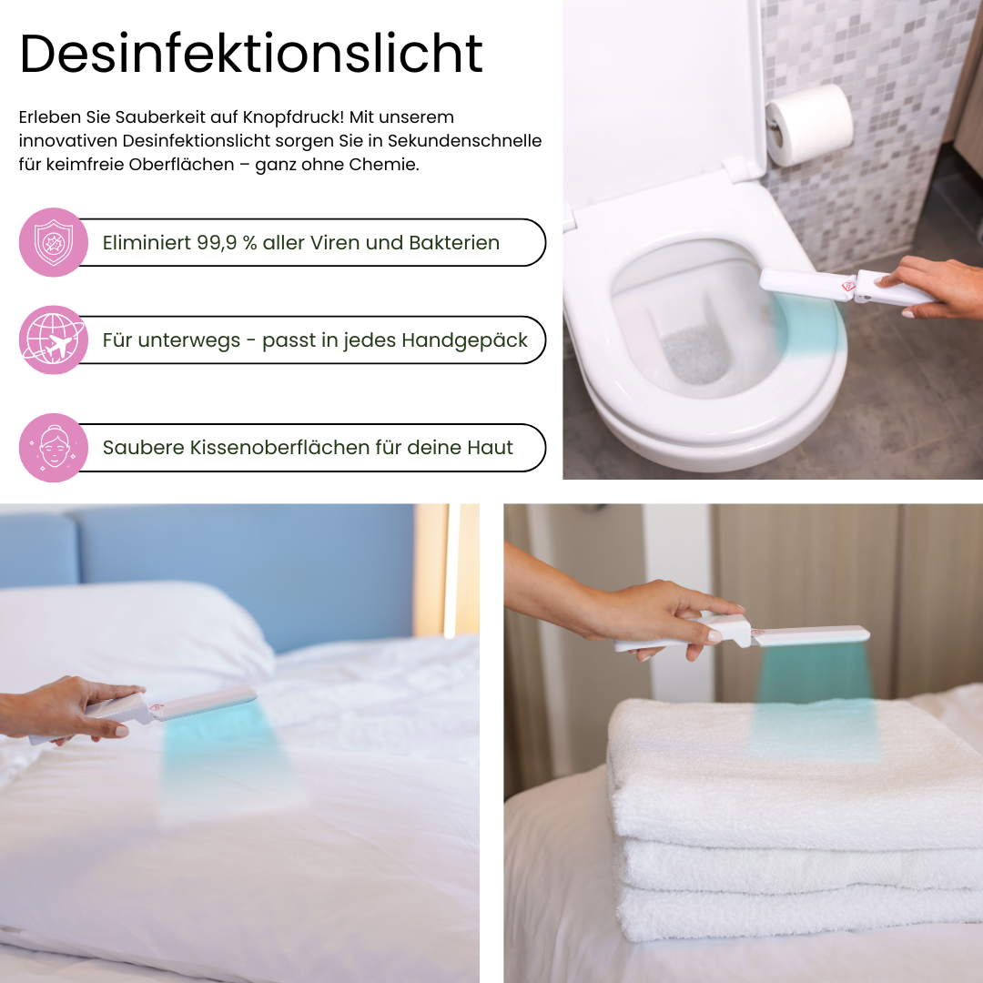 Bakterien und Viren lauern überall – auf Toiletten, Kissen oder unterwegs. Mit dem Desinfektionslicht eliminierst du 99,9 % aller Keime in Sekundenschnelle, ganz ohne Chemie. Praktisch und kompakt, passt es in jedes Handgepäck.